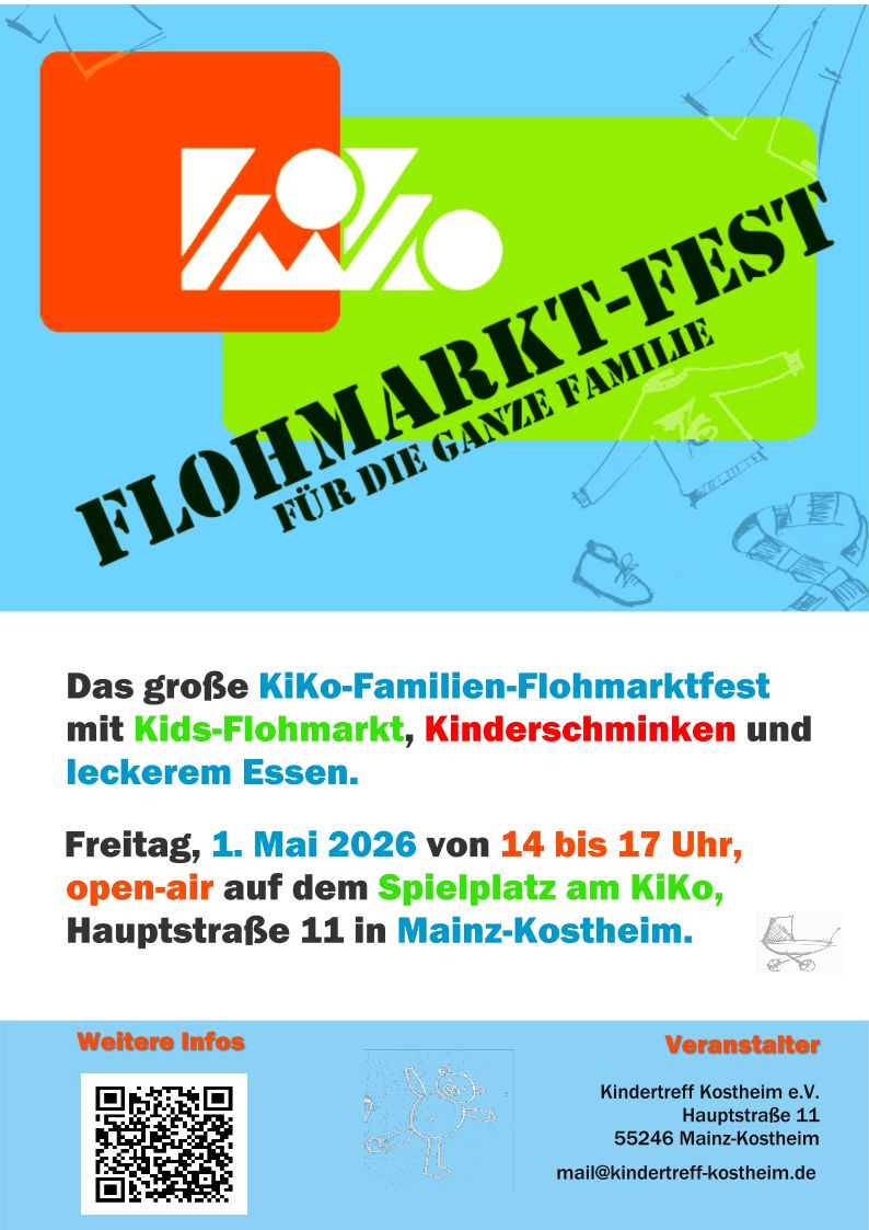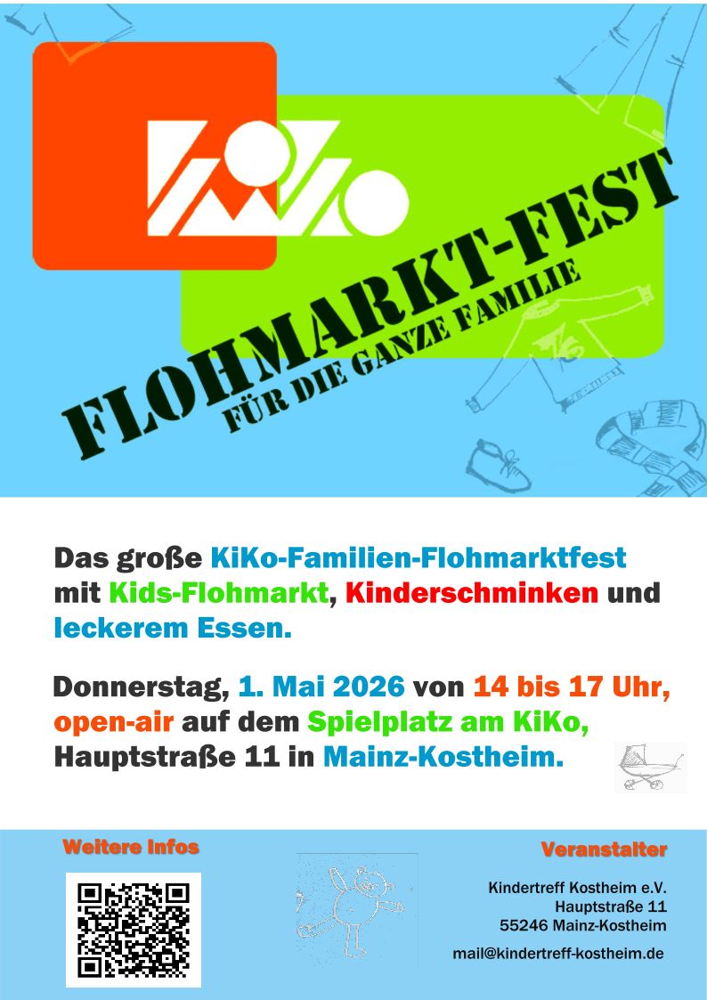 Am 1. Mai von 14-17 Uhr planen wir wie immer unser Flohmarktfest für die ganze Familie. Eltern können in Ruhe nach Schnäppchen stöbern oder Freunde treffen. Kinder können sich währenddessen fantasievoll schminken lassen oder auf Decken ihre eigenen Spielsachen verkaufen. Leckere Kuchen, gegrillte Würstchen und süße Kleinigkeiten warten auf euch! Der Aufbau für alle Standbetreiber beginnt um 13 Uhr.