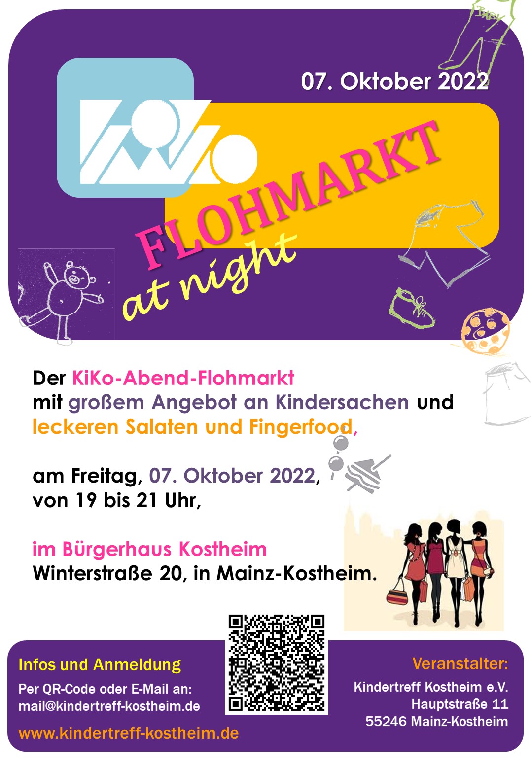 Shoppen gehen und Freunde treffen am Abend in Kostheim mit herzhaften Snacks, Salattheke und Kaltgetränken?! Selbstverkäufer bieten gut erhaltene Kindersachen und Spielzeug an. Tische werden gestellt. Die Standgebühr beträgt 12 €, KiKo-Mitglieder bringen stattdessen einen herzhaften Snack oder einen Salat mit. Die Tische sind ca. 1,50 m breit, daneben und davor ist Platz, um noch Sachen auszustellen. Der Aufbau beginn ab 18 Uhr.