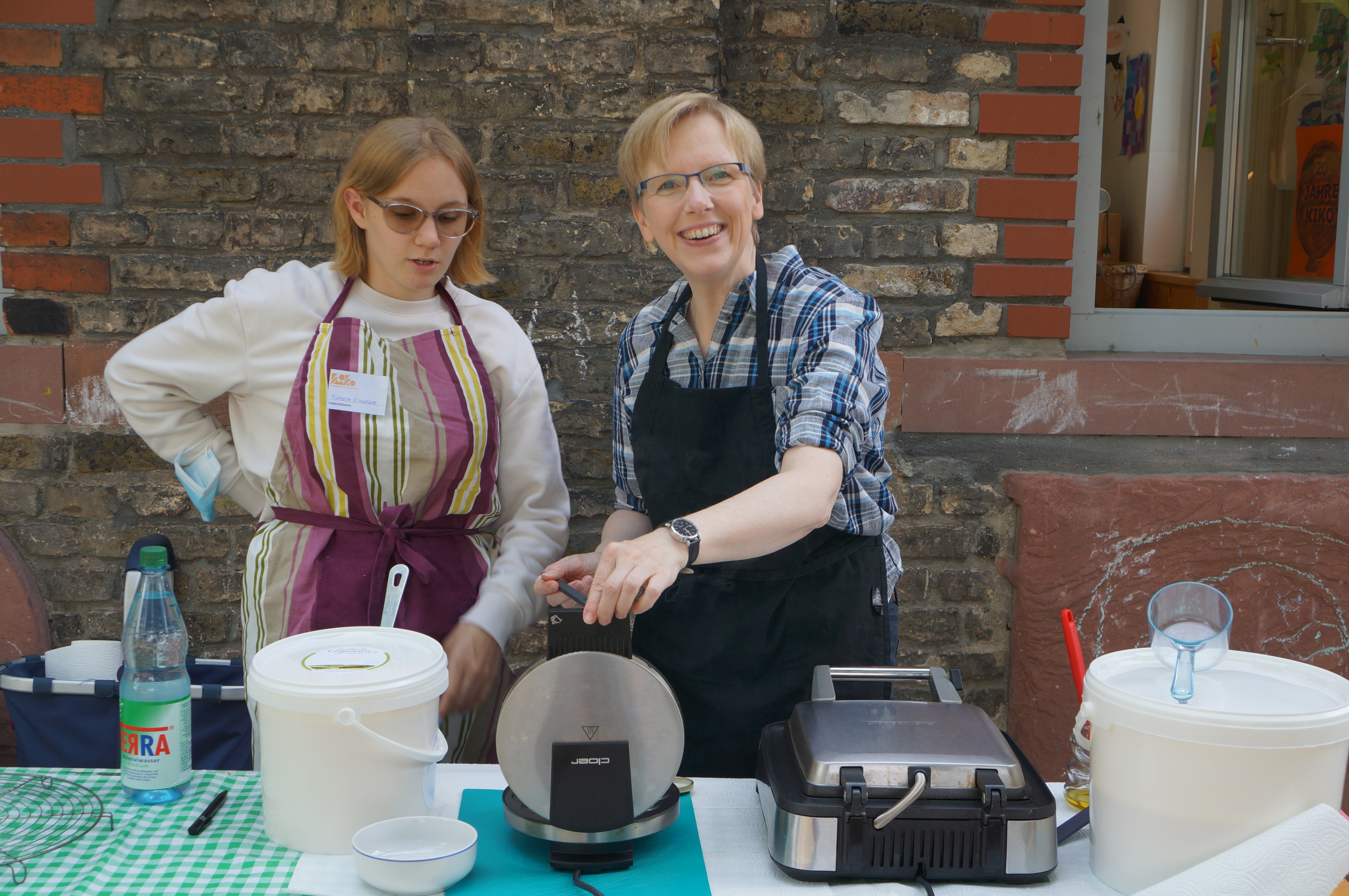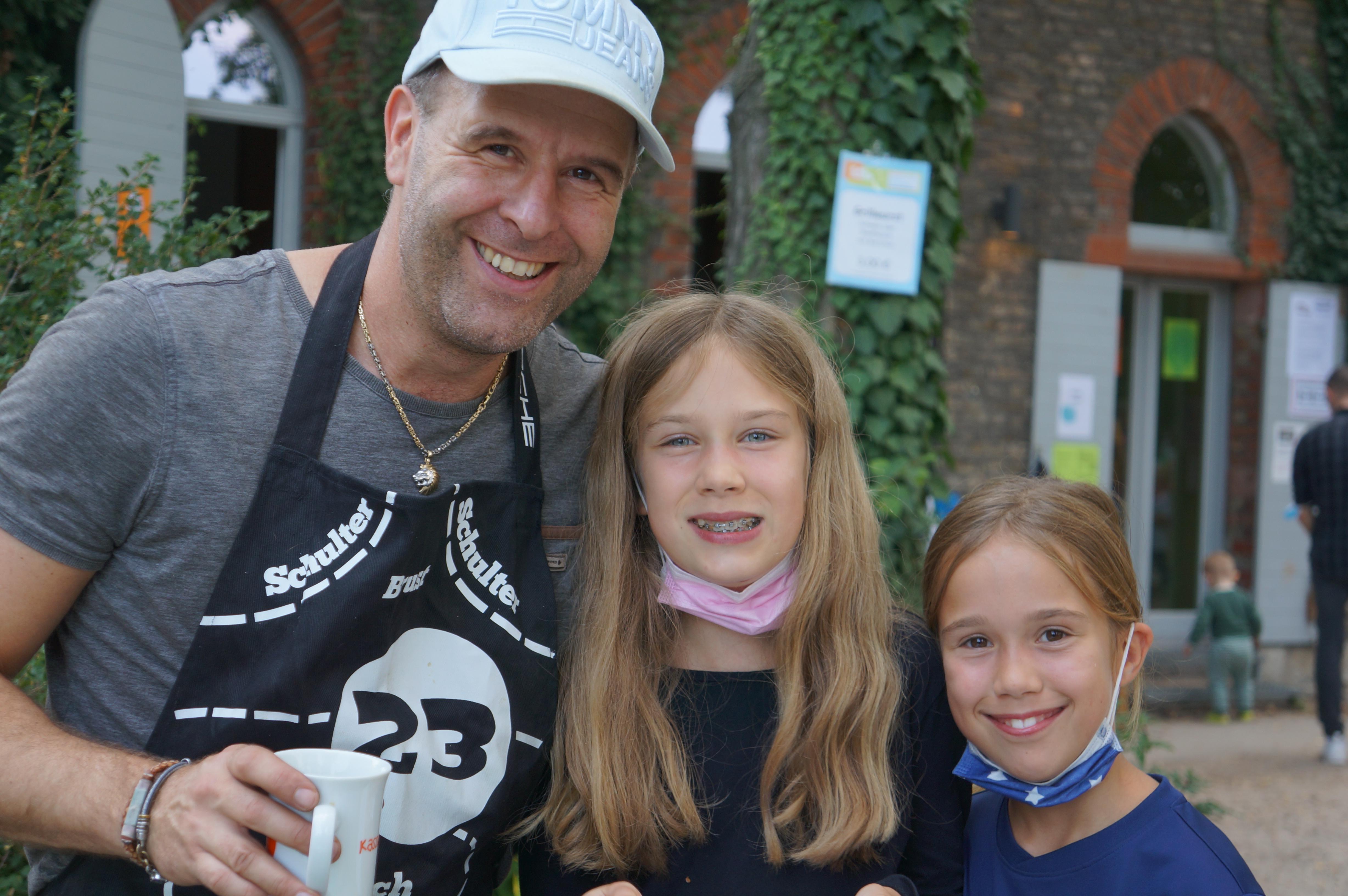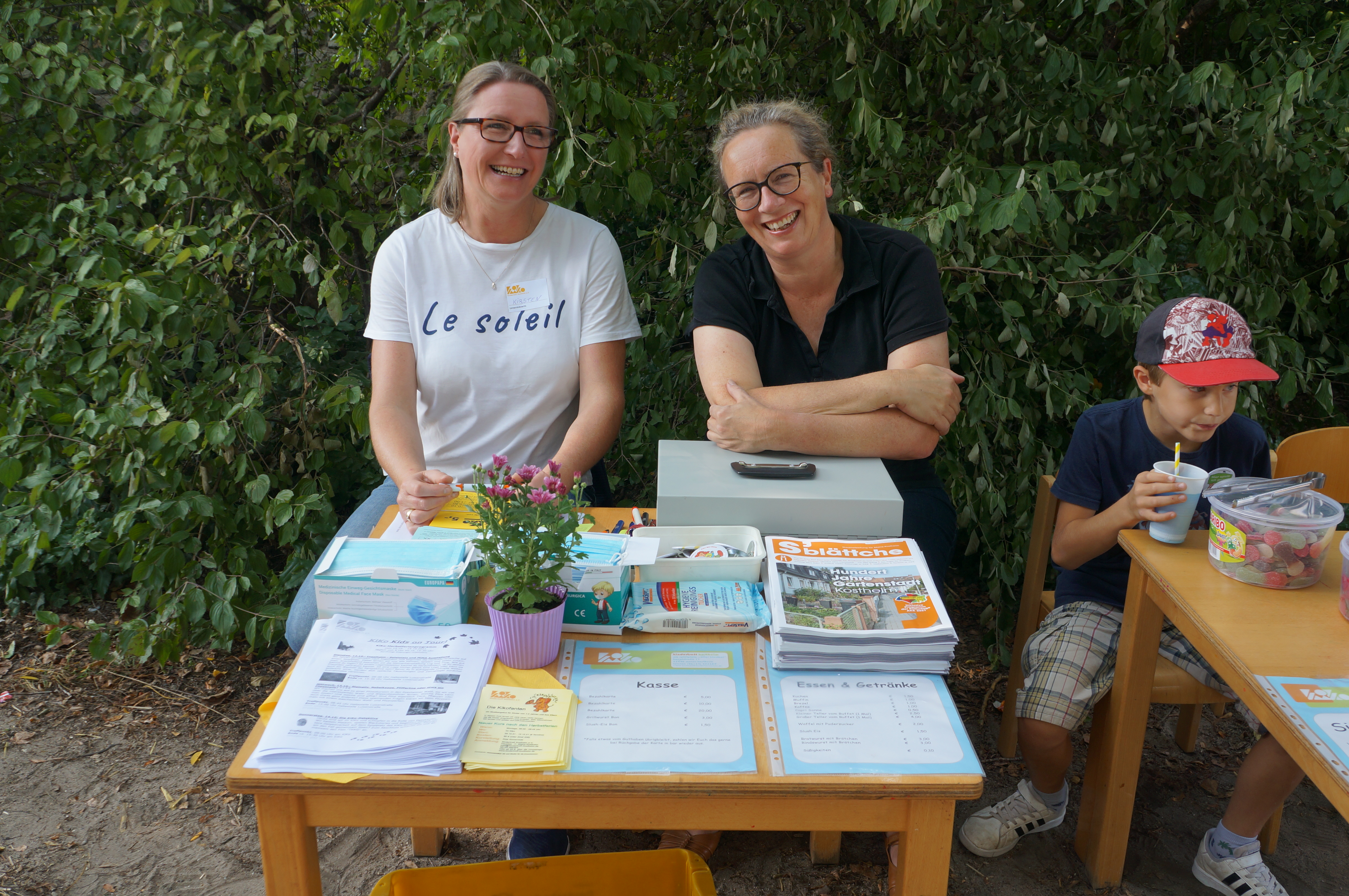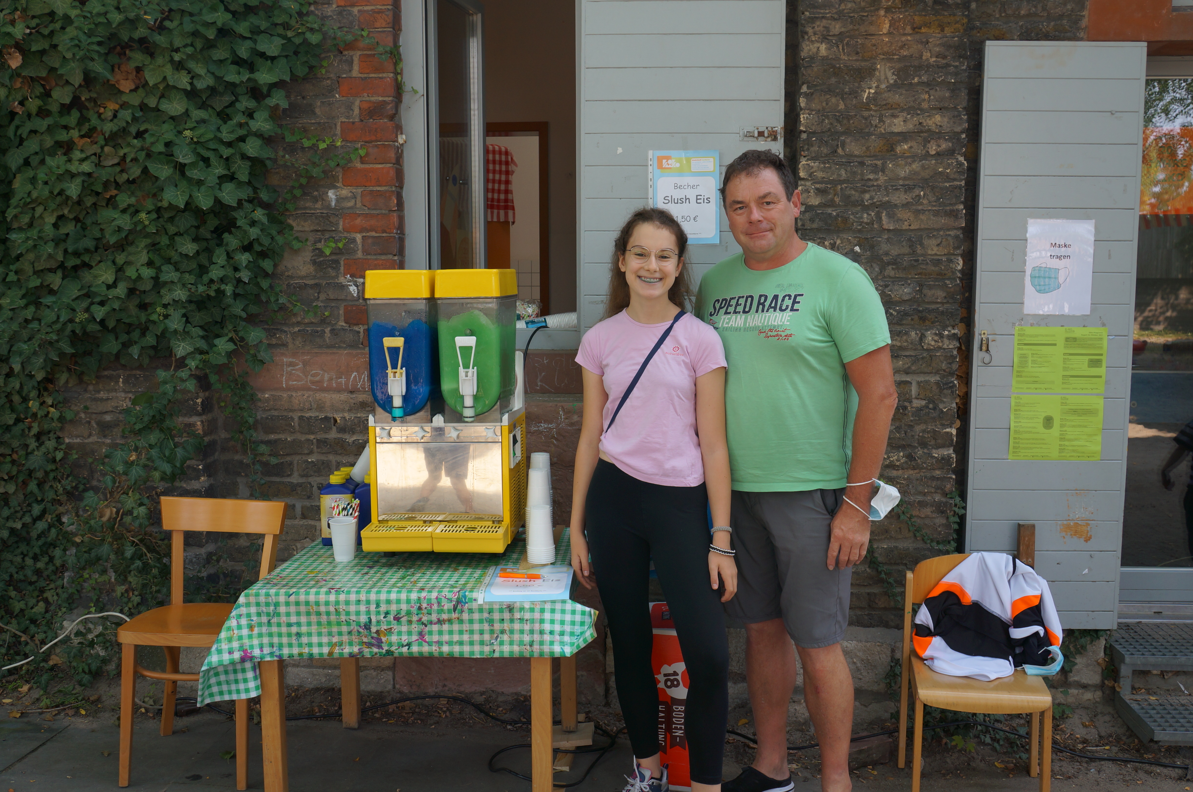 Wir möchten allen danken, die an der Kuchentheke (hier stellvertretend Dana und Patrizia, die beide Doppelschichten geschoben haben), der Kasse (danke Corinna und Kirsten, Marion und Albert, der vom KiKo Mini zum KiKo Maxi wurde), dem Grill (hier Heiko Grischow, ehemaliges Vorstandsmitglied, mit seinen Töchtern Rose und Wolke den ganzen Tag im Einsatz), dem Waffelstand (hier Karoline Deissner, ehemaliges Vorstandsmitglied, mit Familie den ganzen Tag am Stand), dem Slush-Eis-Stand (hier wie immer Helmut Fank und Familie ehrenamtlich mit eigener Slush-Maschine) und dem Süßigkeitenverkauf mitgeholfen haben. Ohne dieses ehrenamtliche Engagement ist so ein Fest nicht machbar.