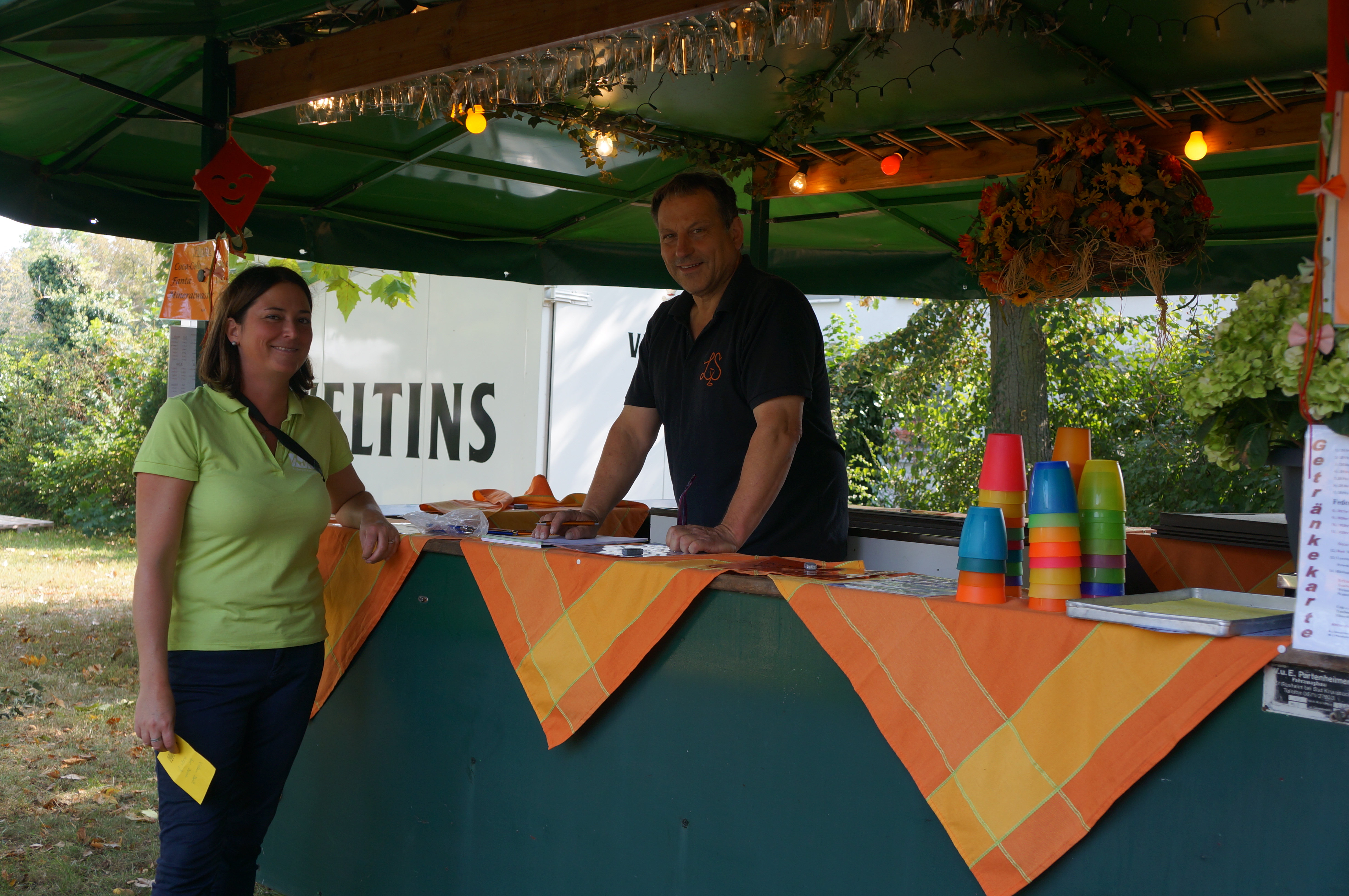 Sein Getränkestand hat uns Arbeit gespart und leckere, kühle Getränke bis in den späten Abend gesichert! Er hat uns zuliebe für die alkoholfreien Getränke familienfreundliche Preise genommen und wir haben ihn sicher so manche Nerven gekostet - zum Beispiel als wir ihn während des Aufbaus fragten, ob er uns nicht doch noch Stehtische und Bierbänke leihen kann. Natürlich ist er nochmal gefahren und hat uns welche geholt, aber mit seinem eigenen Aufbau wurde es dann doch etwas stressig... Zusätzlich hat er dem KiKo drei Kisten Wein für zukünftige Veranstaltungen gespendet.