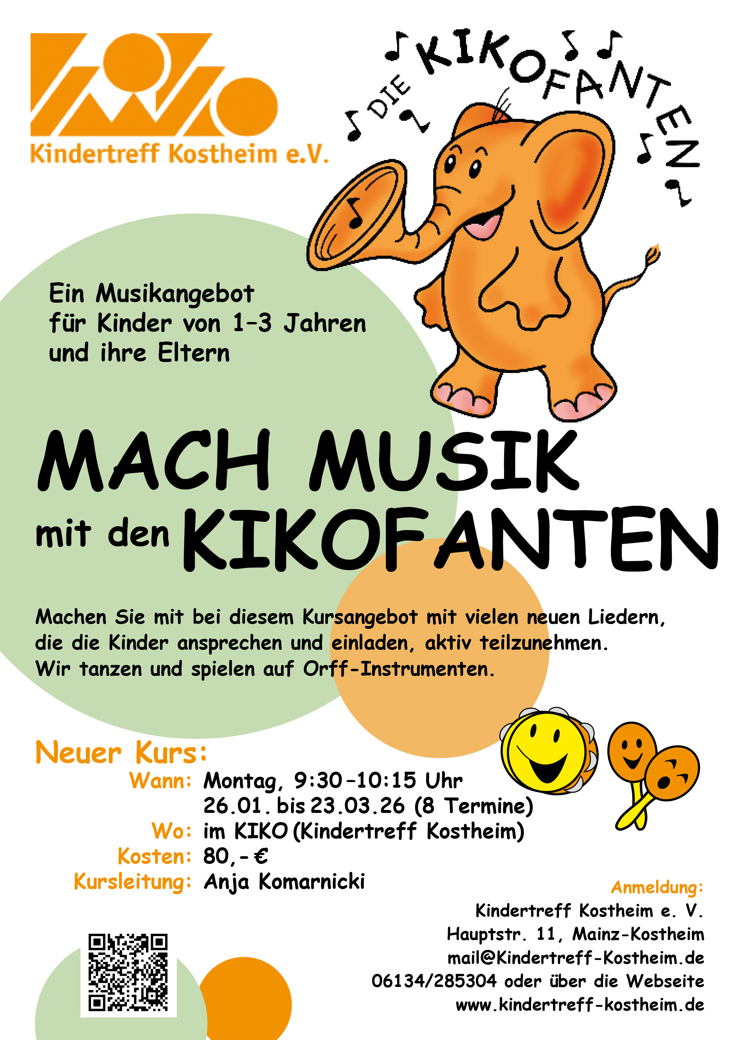 Als Angebot für die Kleinsten wurden im KiKo die trötenden Kikofanten ins Lebens gerufen - ein Musikkurs für 1 bis 3-jährige Kinder in Begleitung eines Elternteils. Die Musikpädagogin Anja Komarnicki tanzt, singt und musiziert mit den Kinder wöchentlich auf Orff-Instrumenten im Kiko, was allen große Freude bereitet.