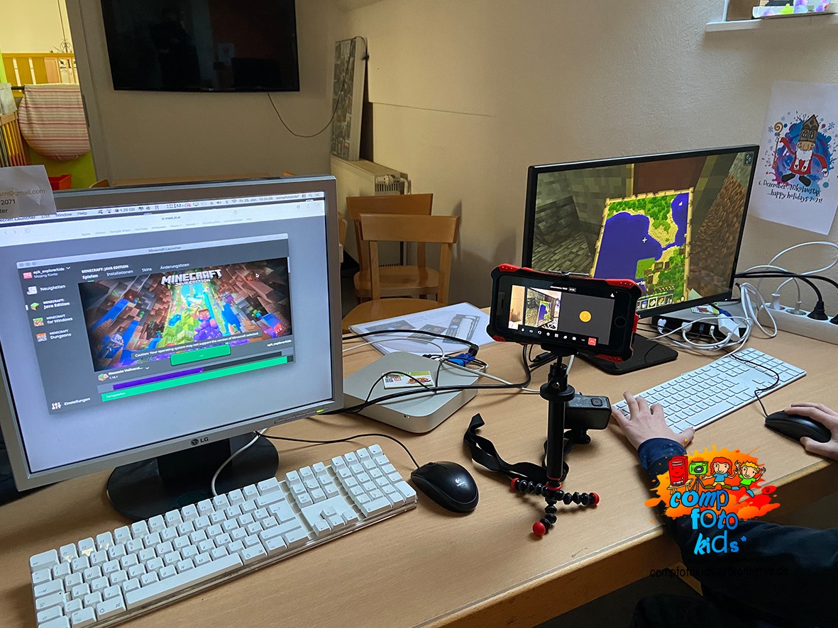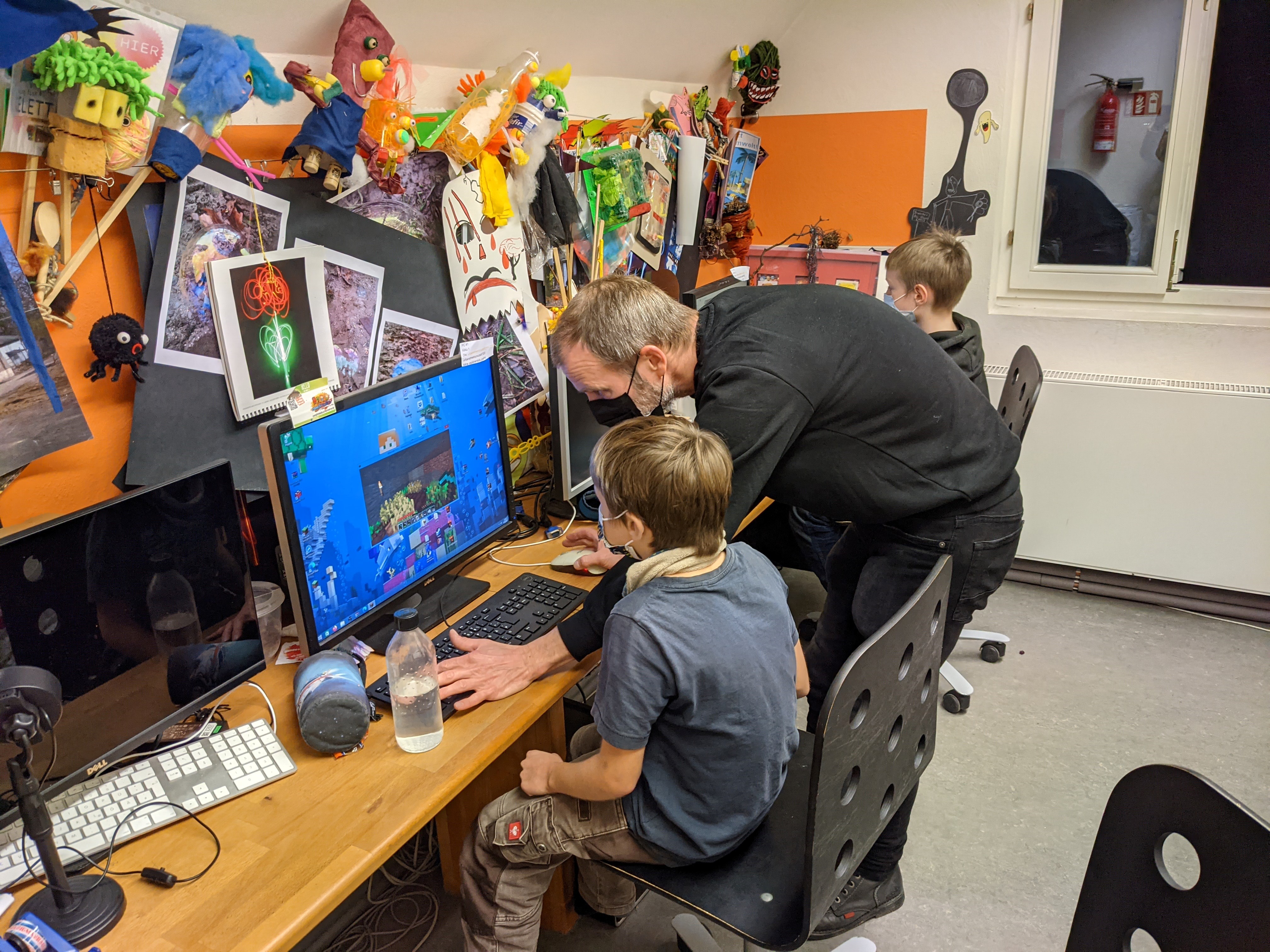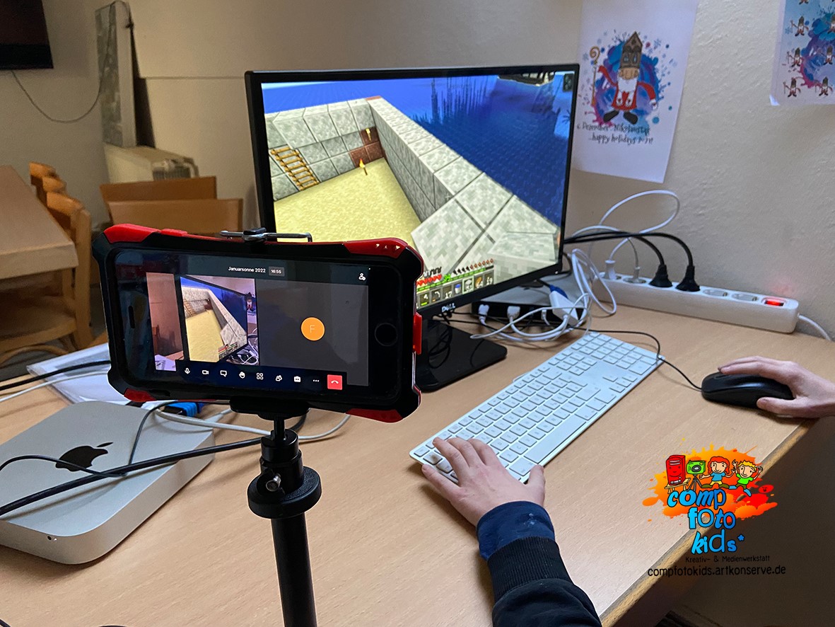 Der KiKo stellte auch im 2. Lockdown wieder das Angebot um. Basteltüten und Online-Beschäftigungsideen wurden nun ergänzt durch regelmäßige interaktive Online-Formate. Die Kids die sonst regelmäßig in der Medienwerkstatt mit machten und dort auch gemeinsam Minecraft spielten trafen sich nun wöchentlich zum Online-Spiel mit Jörn. Teilweise wurde die Chatfunktion des Spiels mittels Videochat über Jitsi ergänzt. Der KiKo legte sich ein Tablet für die Mitarbeiter und einen eigenen Zoom-Zugang zu, so dass auch Bastel- und Spielangebote mittels Videokonferenz stattfinden konnten. Die Kinder hatten so die Möglichkeit, die Betreuer und auch andere Kinder immerhin virtuell wiederzusehen. Die interaktiven Angebote wurden im Frühjahr vereinzelt (dann aber sehr begeistert) angenommen - mit Blick auf das bessere Wetter sowie den häufigen Online-Unterricht eine verständliche Entwicklung.