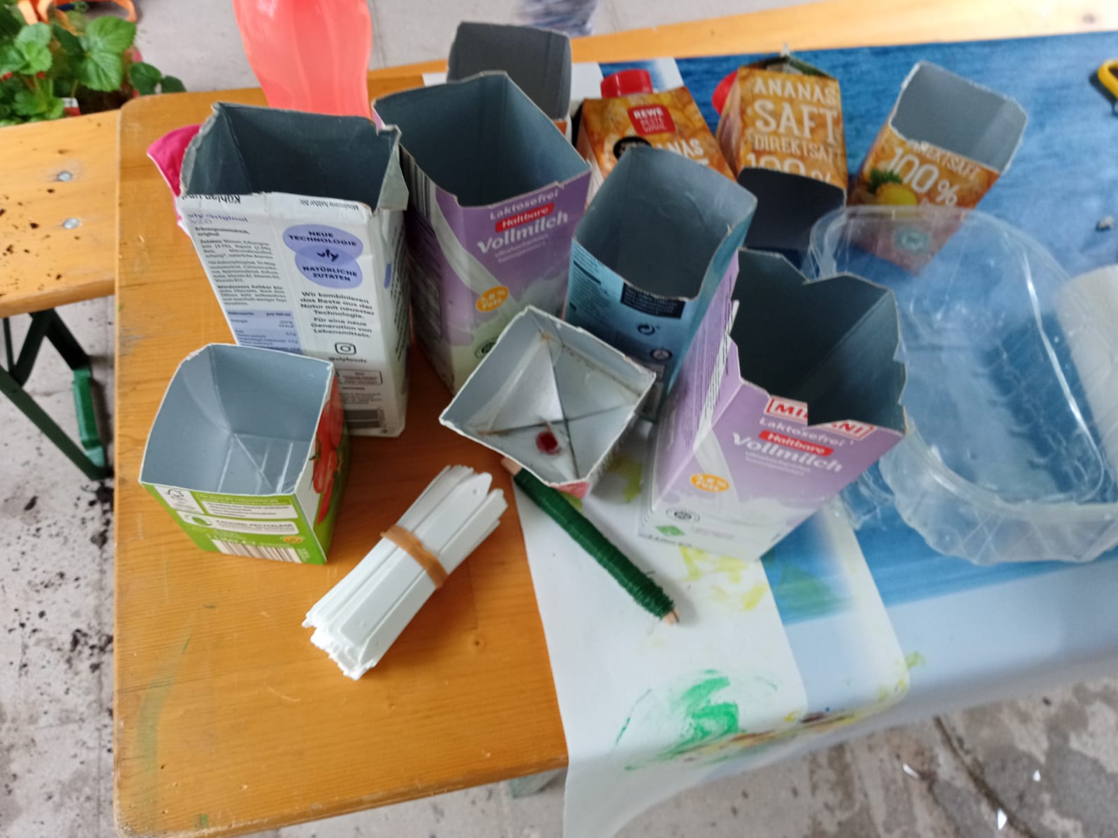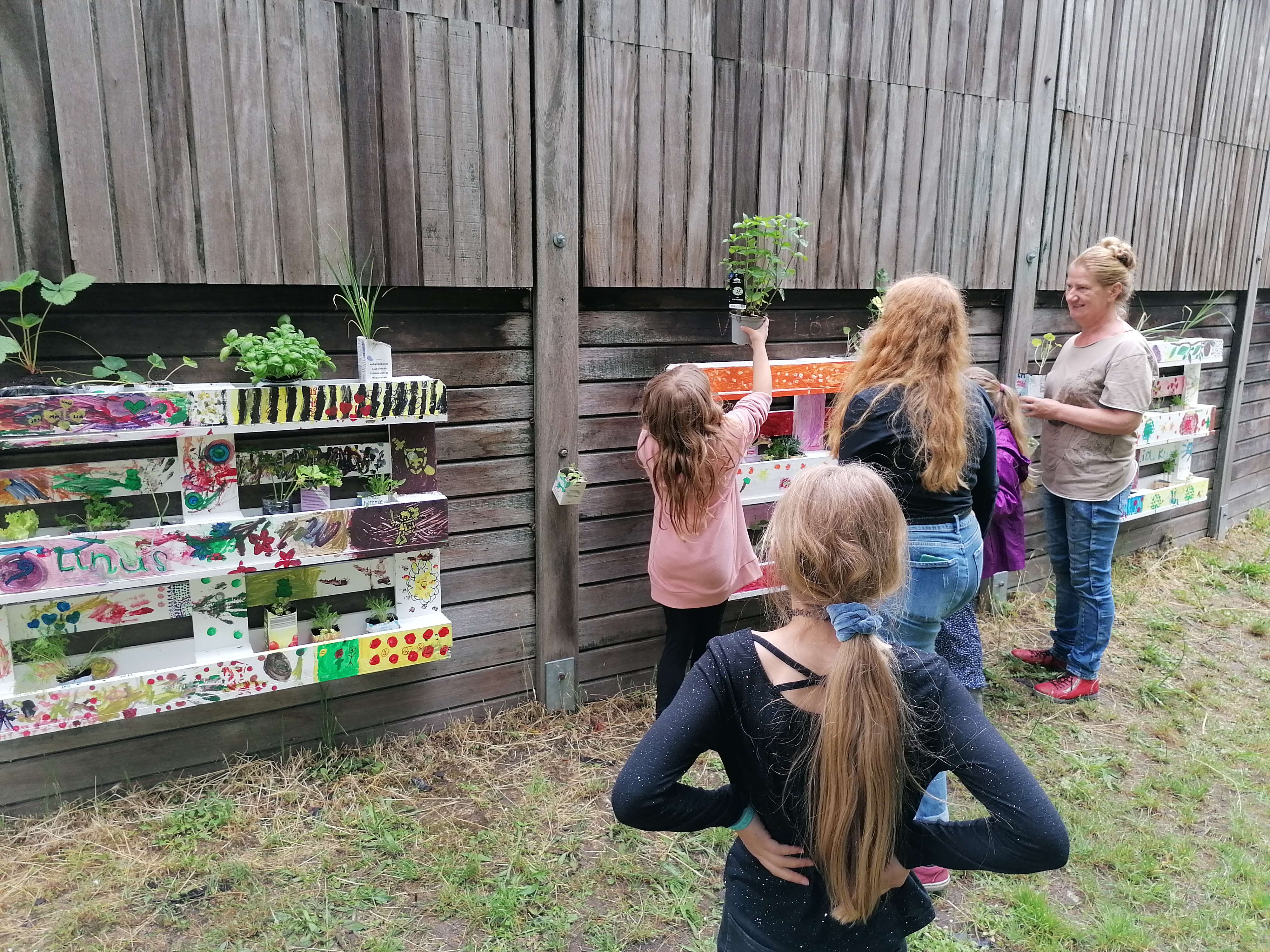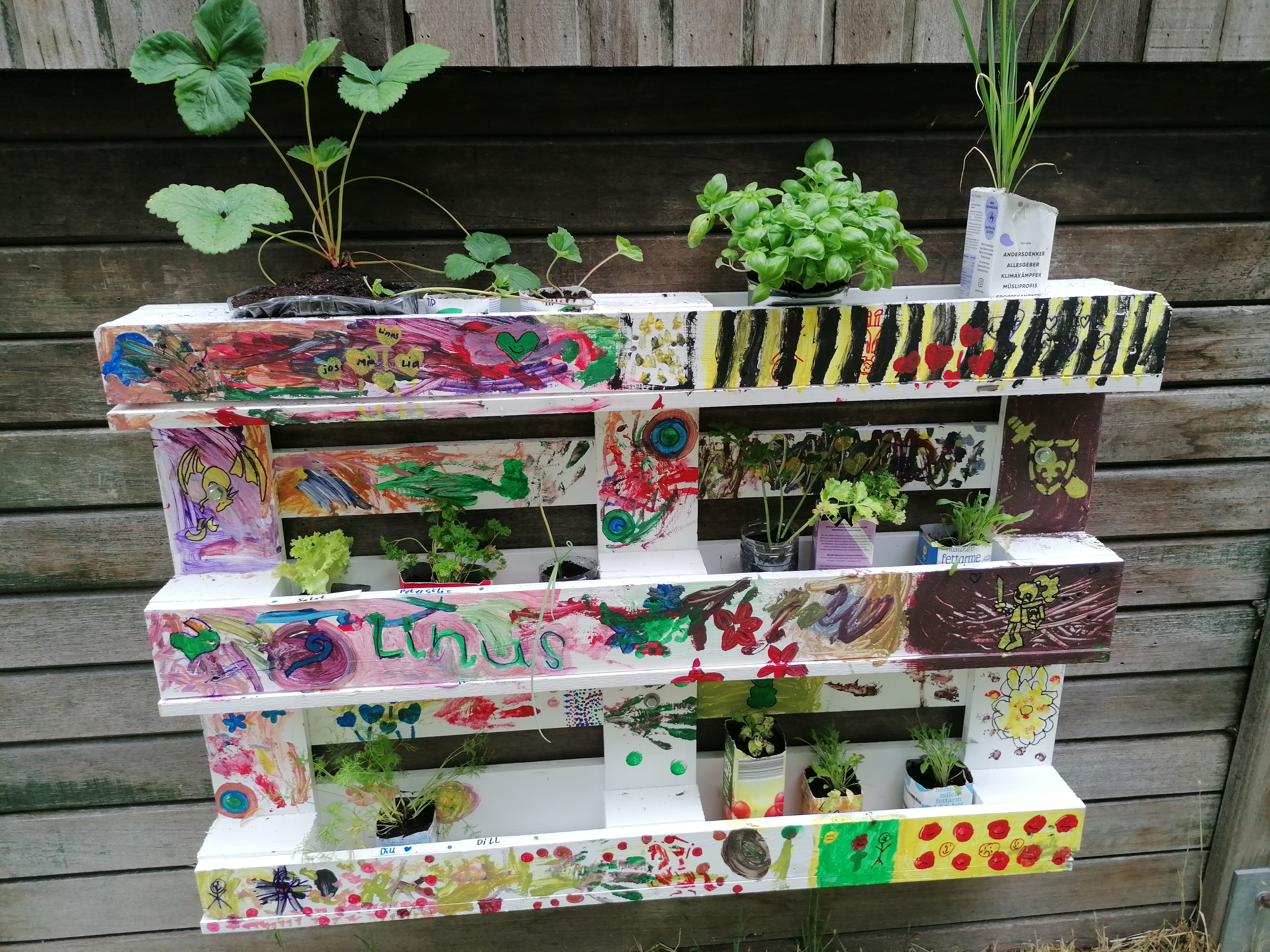 Elli Weishaupt hat mit LEa vom Kiko und 8 KiKo-Kindern die Kunst in den KiKo gebracht! Zum Thema "ökologische Nachhaltigkeit" bauten sie aus Holzpaletten tolle Pflanzgestelle und bemalten diese kreativ. Dosen, Tetrapacks und sonstige Verpackungen wurden zu Pflanzgefäßen umfunktioniert und mit verschiedenen essbaren Pflanzen bepflanzt. Anschließend wurde aus Naturmaterialien Papier geschöpft. Die Paletten hängen nun an der Wand des Spielplatzgeländes und sind ein echter Hingucker! Die KiKo-Pflanzen müssen nun gepflegt werden! Also fühlt euch ruhig verantwortlich sie zu gießen und auf sie aufzupassen.