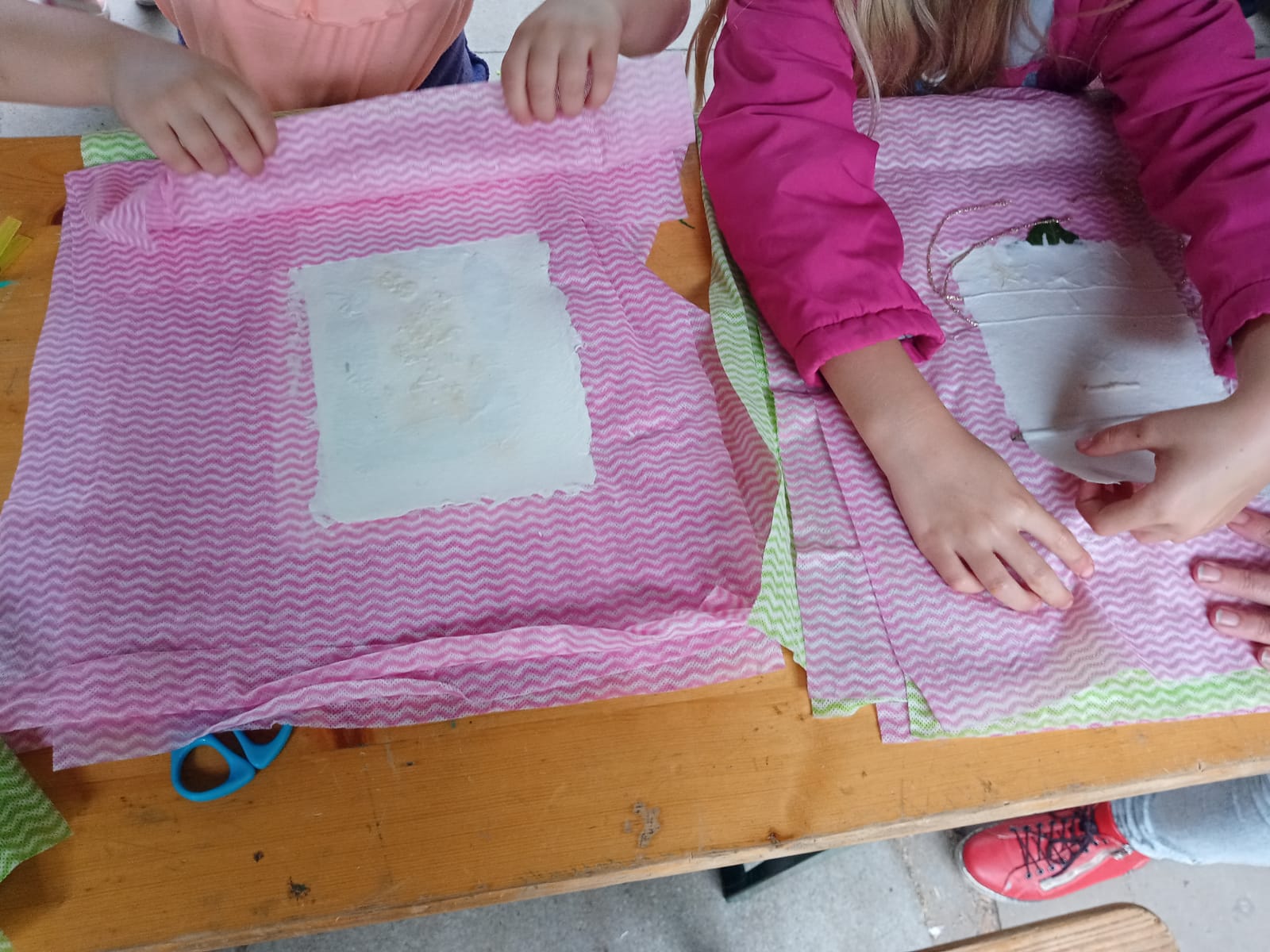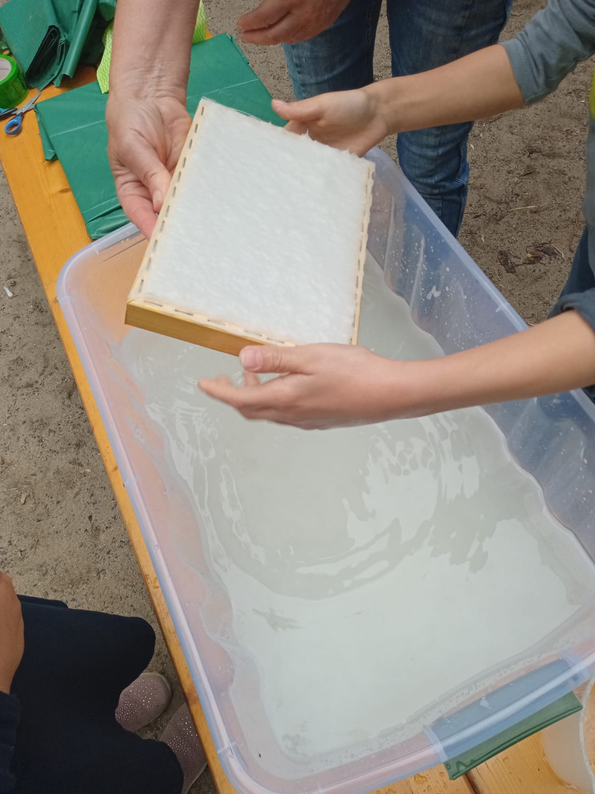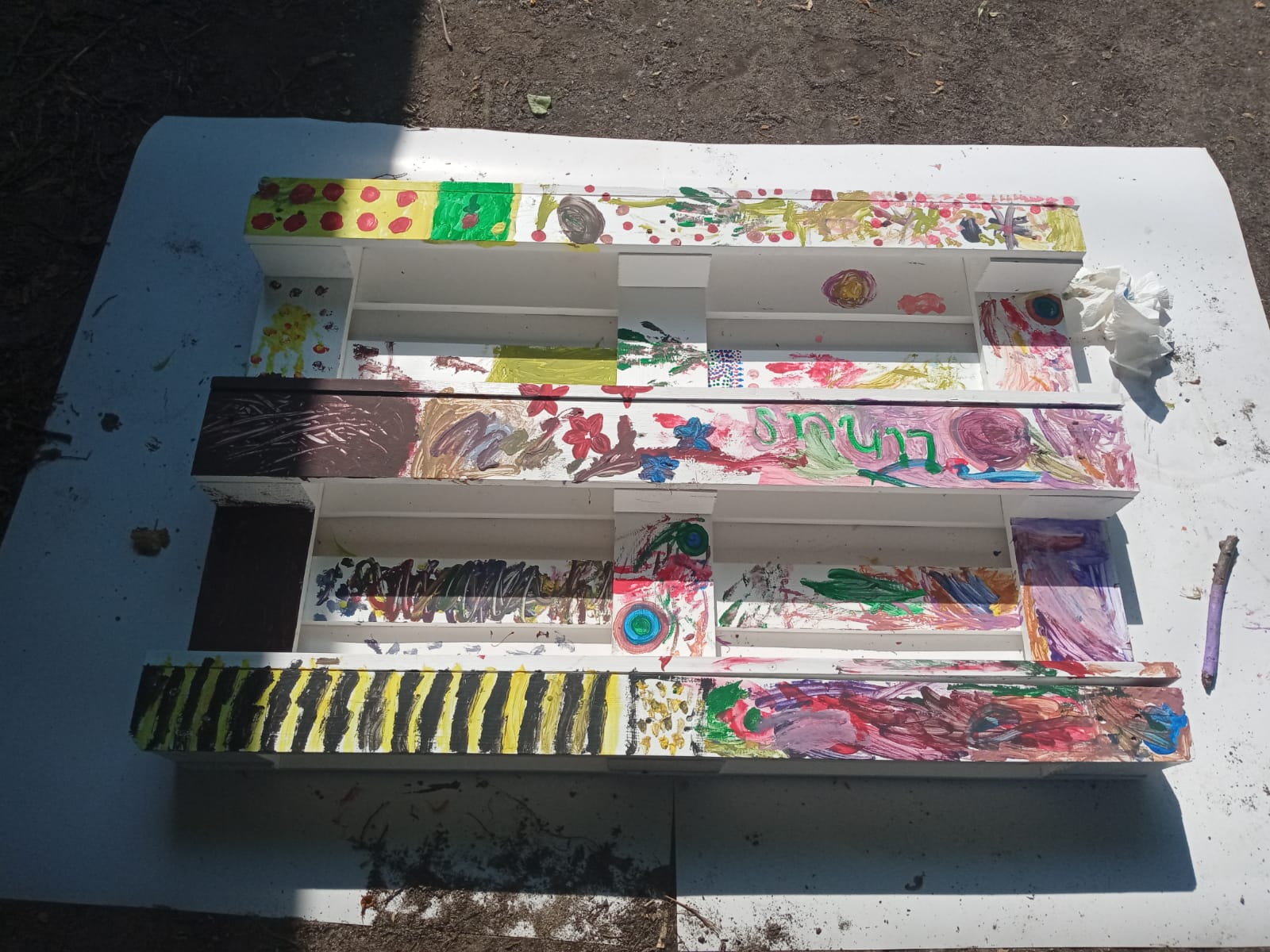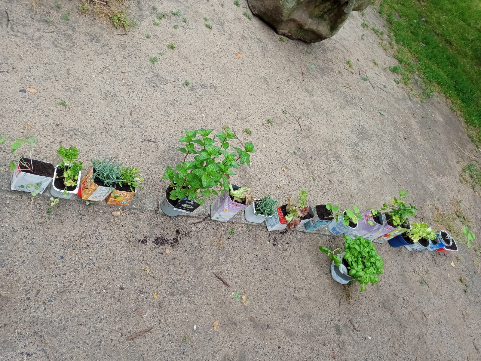 Elli Weishaupt hat mit LEa vom Kiko und 8 KiKo-Kindern die Kunst in den KiKo gebracht! Zum Thema "ökologische Nachhaltigkeit" bauten sie aus Holzpaletten tolle Pflanzgestelle und bemalten diese kreativ. Dosen, Tetrapacks und sonstige Verpackungen wurden zu Pflanzgefäßen umfunktioniert und mit verschiedenen essbaren Pflanzen bepflanzt. Anschließend wurde aus Naturmaterialien Papier geschöpft. Die Paletten hängen nun an der Wand des Spielplatzgeländes und sind ein echter Hingucker! Die KiKo-Pflanzen müssen nun gepflegt werden! Also fühlt euch ruhig verantwortlich sie zu gießen und auf sie aufzupassen.